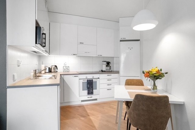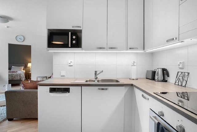 - Jääkaappipakastin, liesi, liesituuletin, uuni, mikroaaltouuni, ja astianpesukone