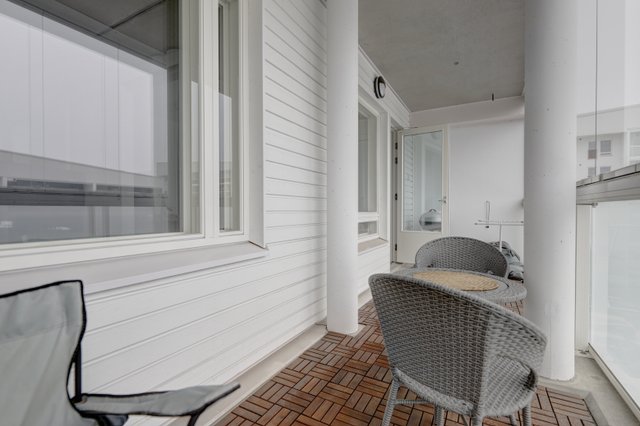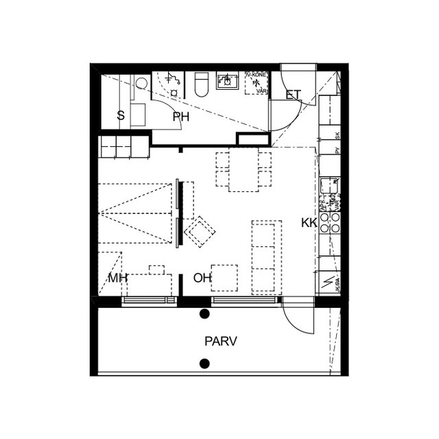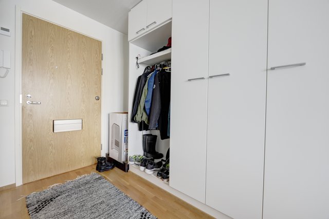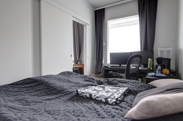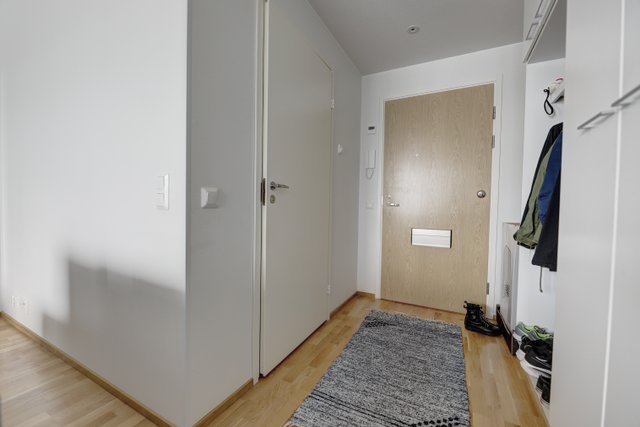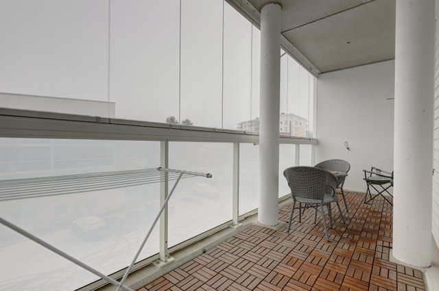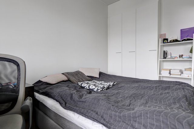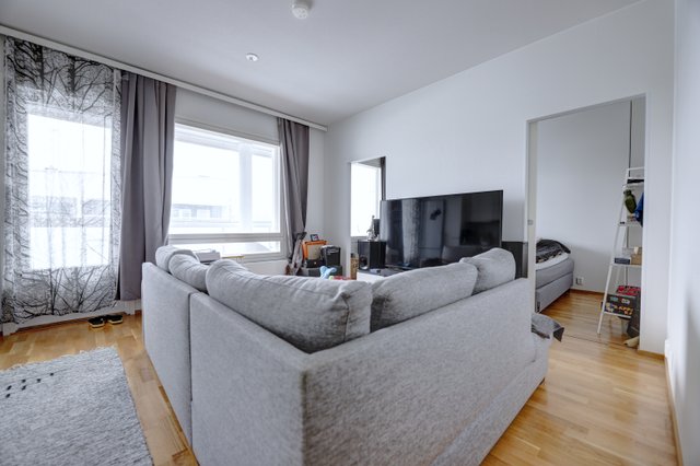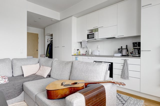 Asunnossa on valoisa yhdistetty olohuone-keittiö ja makuuhuoneeseen pääsee kulkemaan sängyn molemmin puoli. Iso lasitettu parveke toimii kesäisin toisena olohuoneena.