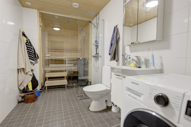 - WC-istuin, suihku, pesukoneliitäntä, peilikaappi, suihkuseinä, lattialämmitys, pesuallas, ja allaskaappi
