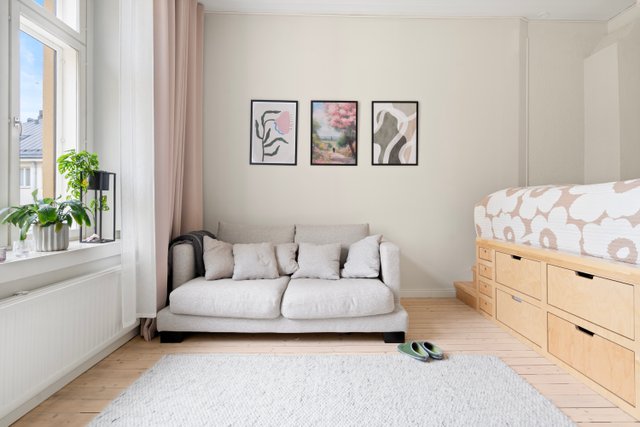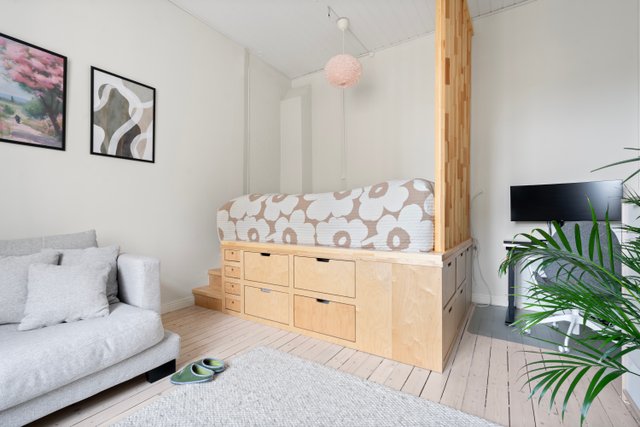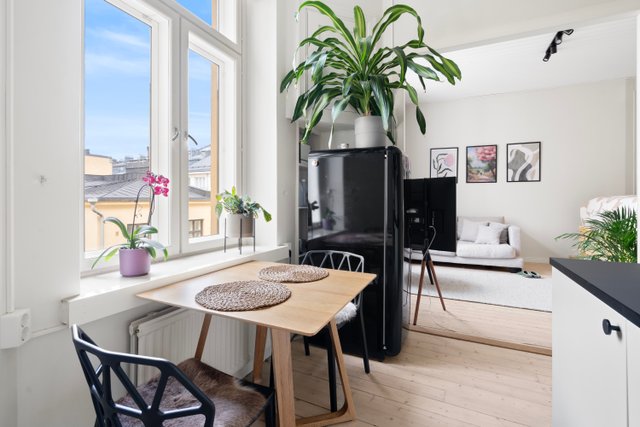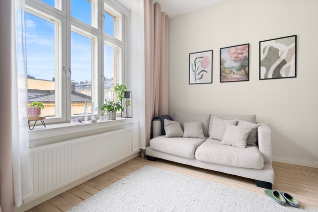 Tämä valoisa ja hurmaava yksiö (34,5 m²) sijaitsee 1908 rakennetun kivitalon 4. kerroksessa. Korkea huonekorkeus, kauniit yksityiskohdat ja alkuperäinen lankkulattia luovat ainutlaatuisen tunnelman. Asunnosta avautuu rauhalliset näkymät sisäpihalle – ja bonuksena asuinkerroksessa on vain kaksi asuntoa eli vain yksi naapuri. Ikkunat kodista ovat rauhalliselle sisäpihalle.