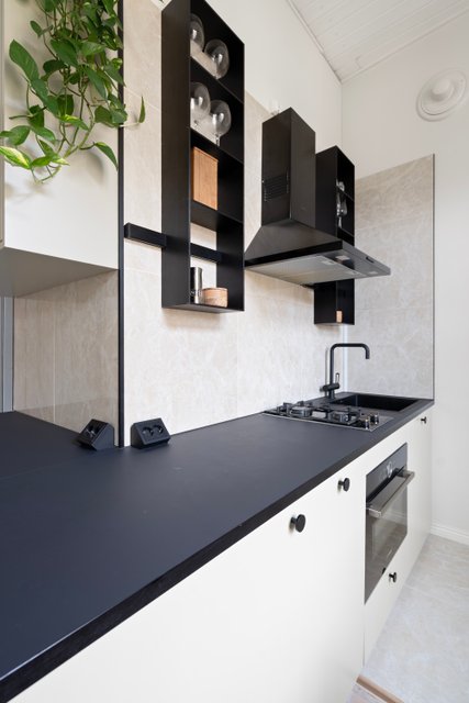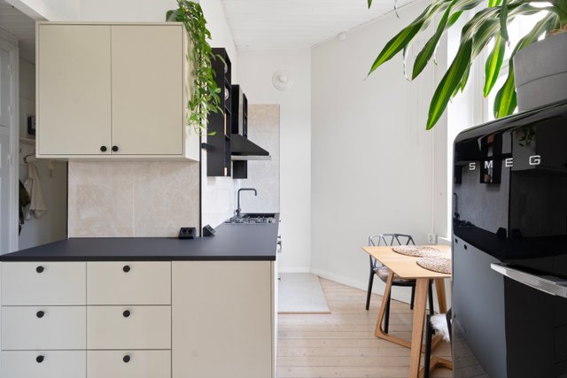 - Keittiössä tehtiin kattava remontti vuonna 2023, jossa yhdistyvät alkuperäisen tunnelman säilyttäminen ja moderni käytännöllisyys: • Keittiökalusteet on teetetty puuseppä Emppu Lemmetyisen mittatilaustyötä. Kalusteet ovat irrotettavissa ja uudelleenasennettavissa esimerkiksi putkiremontin jälkeen – tällöin tarvitsee uusia vain keittiön laatat. • Kodinkoneet: Uusittu vuonna 2023. • Sähköt: Uusittu pintavetoina myös keittiön osalta. • Lattia: Vinyyli poistettu, alkuperäinen lankkulattia hiottu ja maalattu. Huom: lauvuaarin alla on vanhan puuhellan jäänteenä valu ja hieman huonokuntoisempi lankkuosuus, joka ei ole häirinnyt käyttöä. Lattiaa ei ole tiivistetty, mutta sen voi halutessaan tehdä. Pyykinpesukone LG, Astianpesukone Whirlpool, Uuni Bosch yhdistelmäuuni, Kaasukeittotaso Bosch Liesituuletin Cello. Huom. Musta Smegin jääkaappi ja pyykinpesukone ovat sovittavissa erikseen kauppaan. Muut kodinkoneet kuuluvat kauppaan.