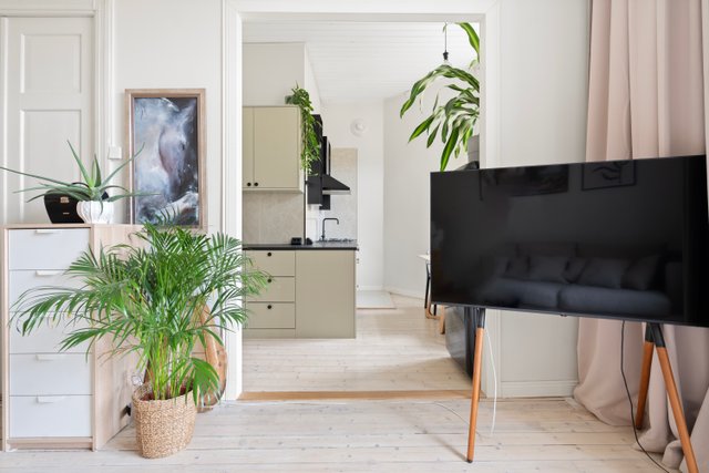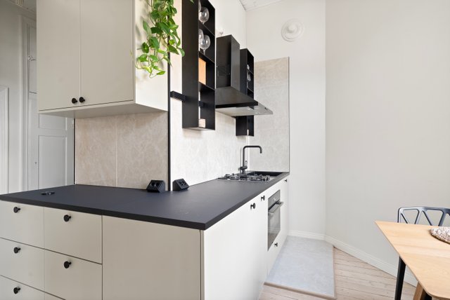 - Olohuoneessa tehdyt remontit (2023) • Lattia: alkuperäinen lankkulattia hiottu ja lakattu, myös kiinteän kalusteen alla oleva alue tehty lattia samalla materiaalilla. Uudet listat asennettu. • Seinät ja rakenteet: tapetit poistettu, seinäpinnat tasoitettu ja maalattu, oviaukko avattu, jälkikäteen rakennettu väliseinä purettu • Ikkunat: ikkunalaudat uusittu – käytetty sama laatta kuin keittiössä, smygit tasoitettu ja maalattu • Ovet ja listat: alkuperäiset ovet entisöity, yksi kaapinkahva rikki (korjattavissa) • Katto ja patterit: katto maalattu, patterit maalattu • Kiinteä kaluste: tehty mittatilauksena paikan päällä, rakennettu osista, joten on tarvittaessa purettavissa tai muokattavissa.