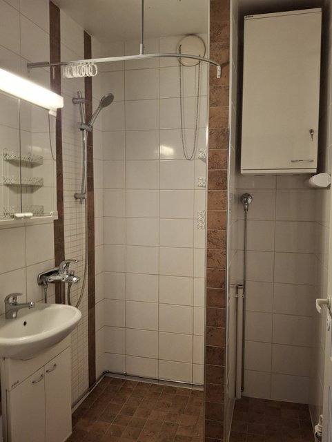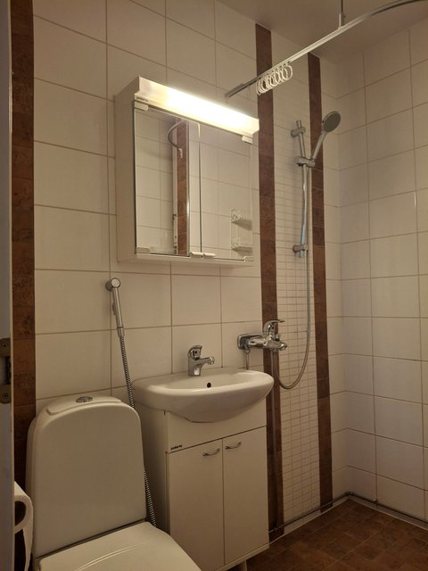 - WC-istuin, suihku, pesukoneliitäntä, lattialämmitys, peilikaappi, pesuallas, allaskaappi, ja bidee-suihku