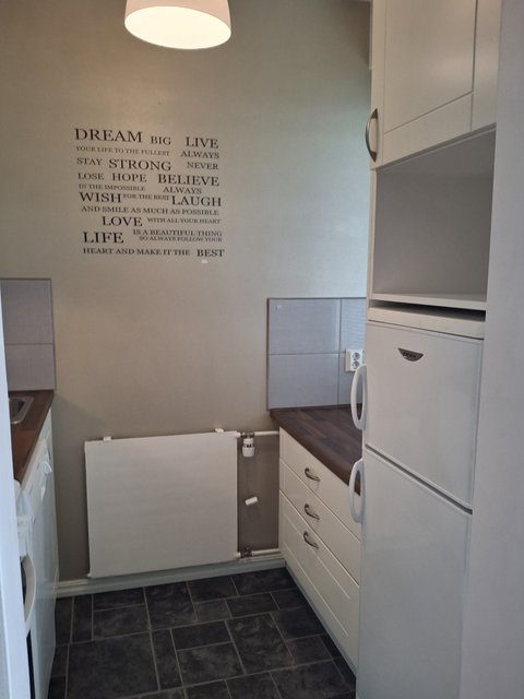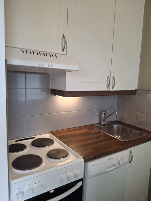 Keittokomerossa on kaikki tarvittavat varusteet, kuten liesi, jääkaappi-pakastin ja astianpesukone, joten arki sujuu vaivattomasti. Kylpyhuoneessa on lattialämmitys, mikä on erityisen miellyttävä talviaikaan. Makuuhuoneessa ja olohuoneessa on laminaattilattiat, jotka luovat yhtenäisen ilmeen.