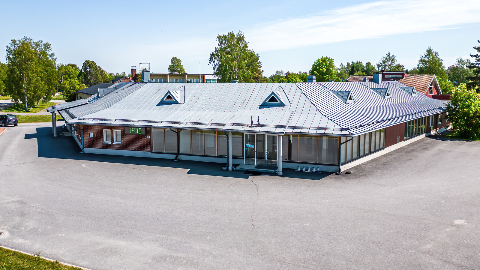 Huvudbyggnaden med tegelfasad har uppförts 1972 och har tillbyggts 1987. Byggnaden har en våningsyta om ca. 655 m2.