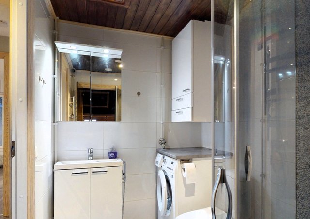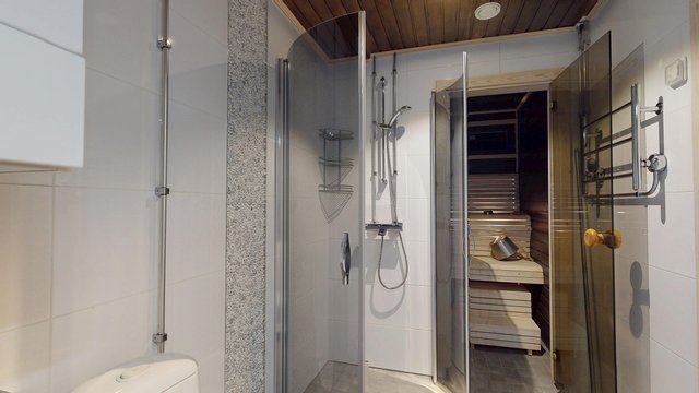 - WC-istuin, suihku, suihkuseinä, pesukoneliitäntä, pesukone, lattialämmitys, peilikaappi, allaskaappi, pesuallas, ja bidee-suihku