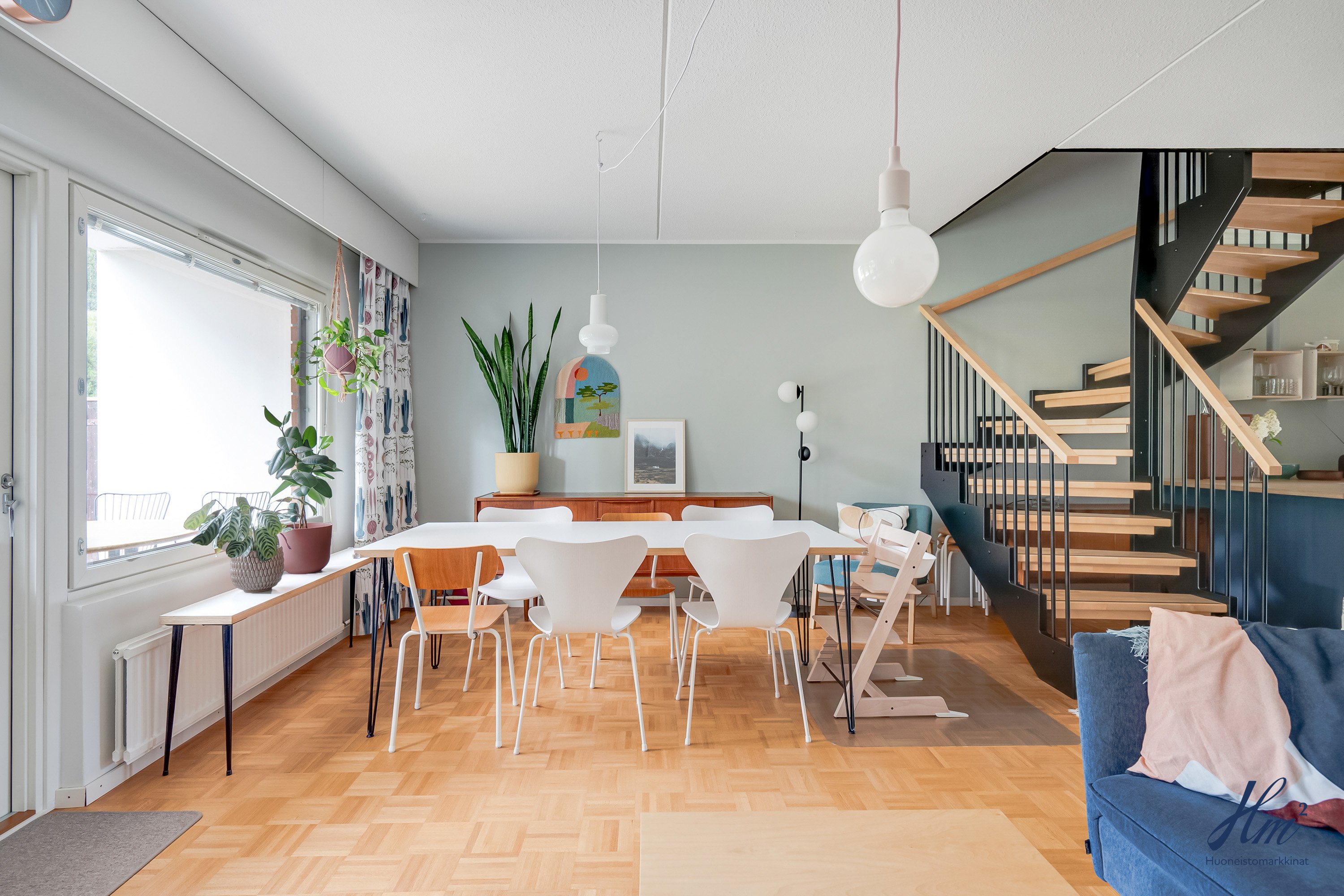 Myynnissä oleva koti on kaksitasoinen rivitalohuoneisto, jonka pinta-ala on 95,5 m². Alakerrassa on valoisa olohuone, josta on kulku omalle terassille ja pihalle. Vuonna 2020 uusittu Puuvajan keittiö tuo tilaan modernin ilmeen. Alakerrassa on myös wc ja vaatehuone. Yläkerrasta löytyvät kolme makuuhuonetta, kylpyhuone, sauna ja parveke. Samana vuonna on tehty laajoja remontteja: keittiön, kylpyhuoneen ja saunan uudistukset, lattioiden kunnostus, uusitut portaat sekä sähköjen ja käyttövesiputkien uusiminen. Huoneistoon kuuluu autokatospaikka, ja taloyhtiössä ei ole suunnitteilla suurempia remontteja.