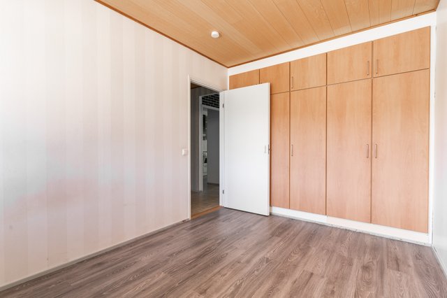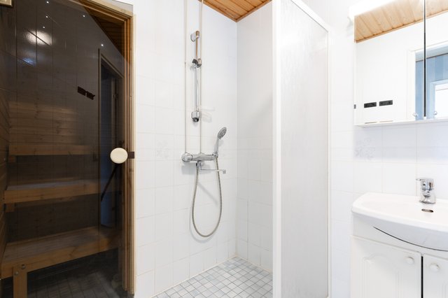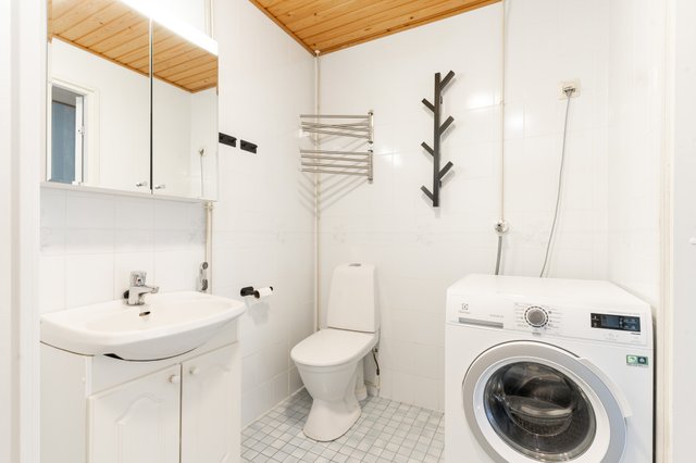 Makuuhuoneessa on koko seinän leveydeltä säilytyskaapistot. Kylpyhuoneessa on lattialämmitys ja sinne mahtuu hyvin isompikin pyykinpesukone.