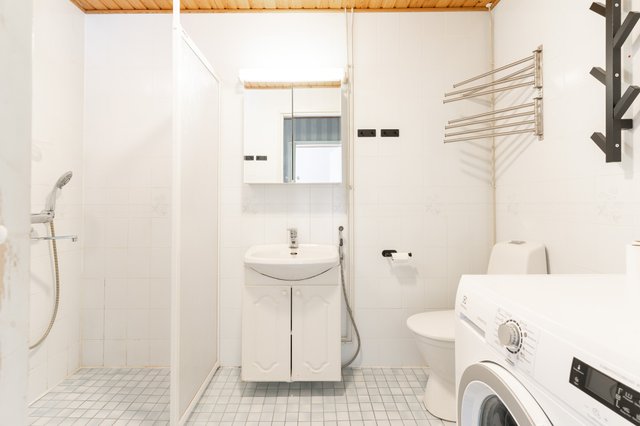 - Varusteet: Pesukoneliitäntä, lattialämmitys, pesuallas, allaskaappi, wc-istuin ja suihkuseinä Seinämateriaalit: Kaakeli Lattiamateriaalit: Laatta