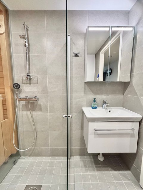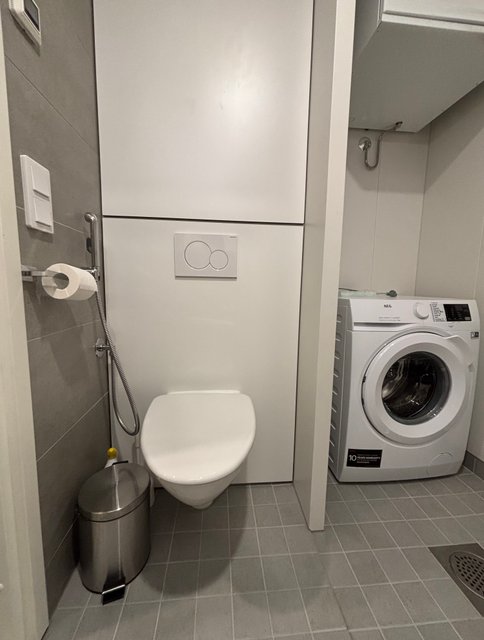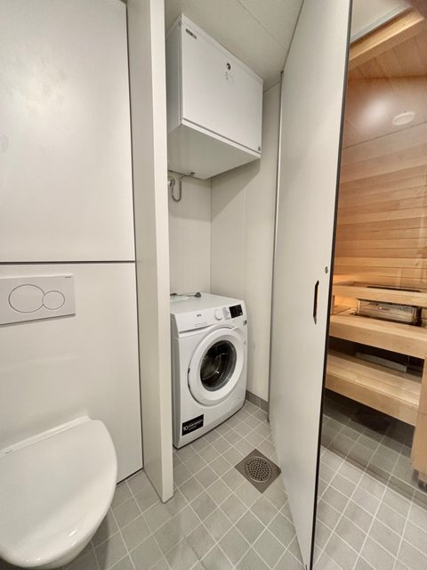- Suihku, suihkuseinä, wc-istuin, pesukone, peilikaappi, pesuallas, allaskaappi, ja bidee-suihku