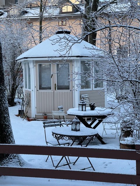Talon edessä on oma vehreä piha-alue. Pihan kruunaa vuonna 2020 rakennettu viihtyisä huvimaja, joka kutsuu nauttimaan aamukahvista ja kesäillan illallisista – täydellinen paikka viettää aikaa ja nauttia vuoden kaikista hetkistä aina keväästä pitkälle syksyyn.