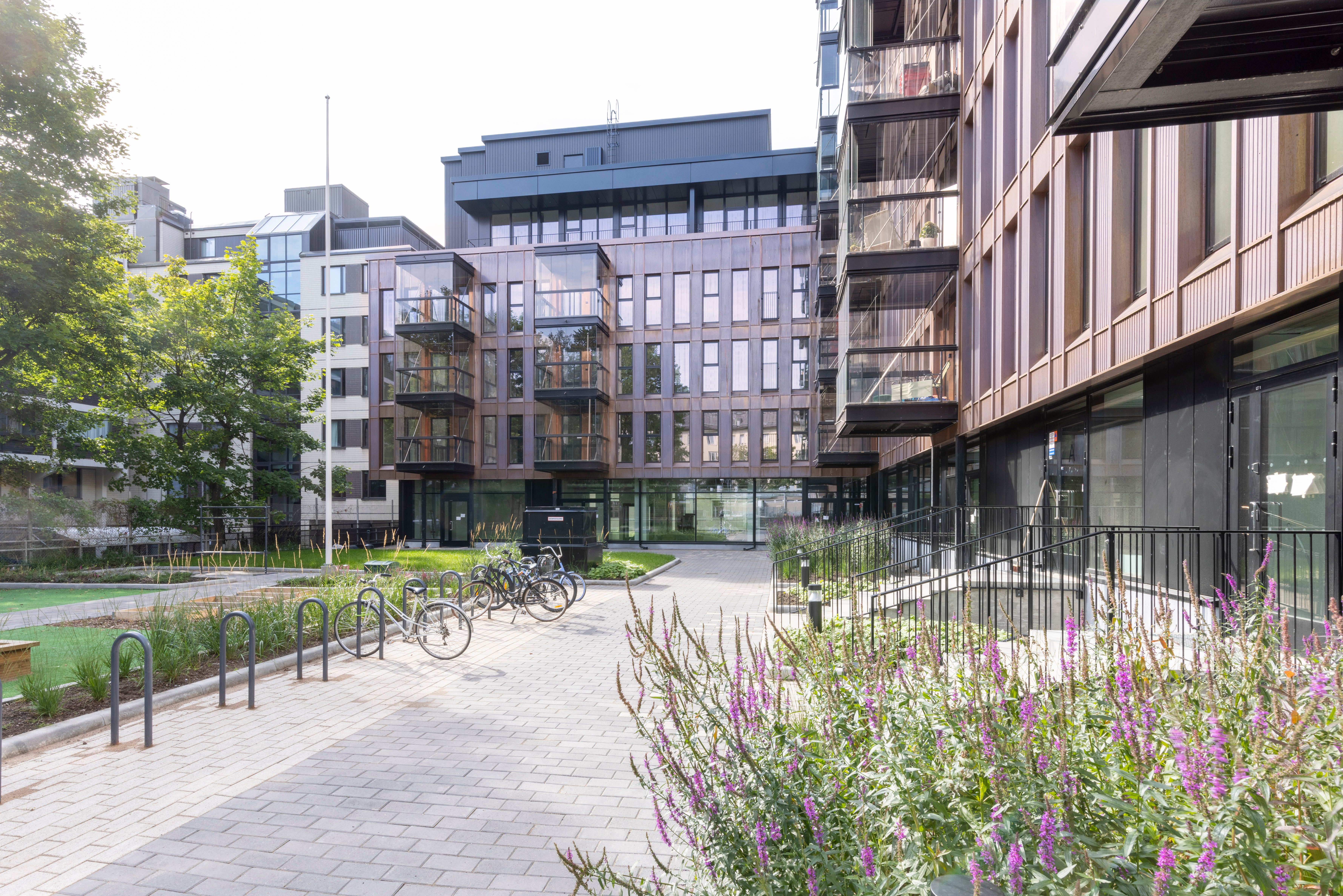 - Rauhallisen vehreä sisäpiha tällä sijainnilla on todellista luksusta. Maisemasuunnittelutoimisto Carmenian hortonomi Meeri Alatalon pihasuunnittelun tavoitteena on ollut luoda tilaan kodikasta tuntua ja mahdollistaa eri toimintoja. Lähtökohtaisesti korttelin puut rajaavat yhtiön pihan kodikkaasti. Pihalta löytyy avoin nurmialue pelailuun ja leikkimiseen, lasten keinu ja hiekkalaatikko sekä kuusi viljelylaatikkoa jotka mahdollistavat asukkaiden omatoimisen viljelyn. Aurinkoisin osa sisäpihaa on varattu viihtymiseen kasvillisuudella ja kahdella pöytäryhmällä. Heinillä on saatu aikaan korkeampaakin rajausta. Lehtipensaat ja perennat tuovat kesään lisäväriä, kataja ja tuivio tuovat ikivihreinä väriä kaikkiin vuodenaikoihin. Sisäpihan suojassa on myös runkolukitustelineitä pyörille. Lisää pyöräpaikkoja löytyy kellarista ja niille on helppo ajaa autohallin luiskaa pitkin.
