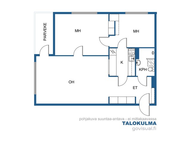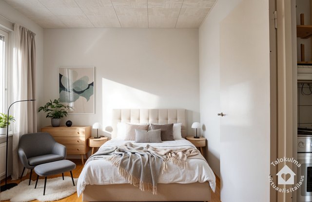 - 2 hyvänkokoista makuuhuonetta. Toinen makuuhuone voi toimia myös ruokailu- työ- tai kirjastohuoneena. Pohja muokattavissa ja väliovia ja kulkuja voi muutella.