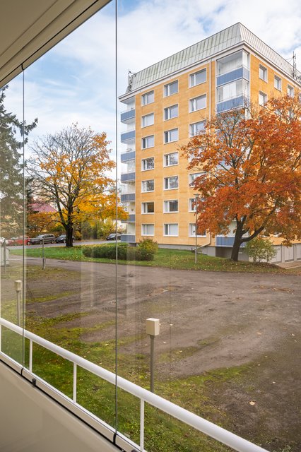 - Valoisa olohuone, josta käynti asunnon lasitetulle parvekkeelle ja toiseen makuuhuoneeseen.