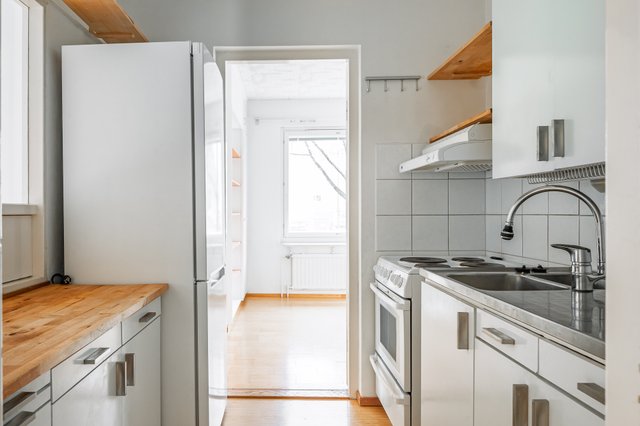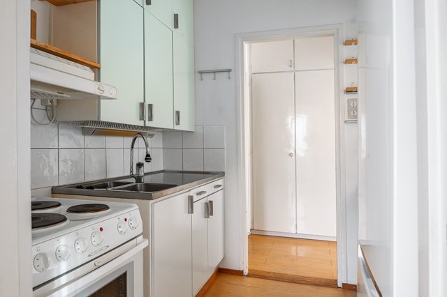 Asunnon seinät on tasoitettu ja maalattu valkoisiksi, joten raikas ilme yhdistyy sopusoinnussa vanhan ajan hengen kanssa. Kaikkien huoneiden kaunis parkettilattia viimeistelee kokonaisuuden.