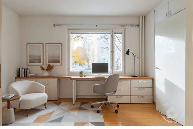 Asunnon pohjaratkaisu antaa mahdollisuuksia monenlaisiin elämäntilanteisiin. Kaksi makuuhuonetta ja tilava olohuone mahdollistavat tilojen muokkaamisen muuttuvien tarpeiden ja elämäntilanteiden mukaan. Toinen makuuhuoneista sopii erinomaisesti myös esimerkiksi ruokailu- työ- tai kirjastohuoneeksi.