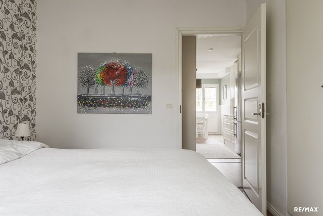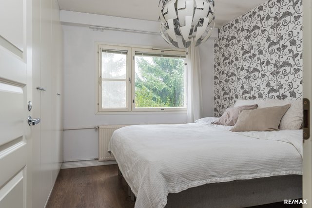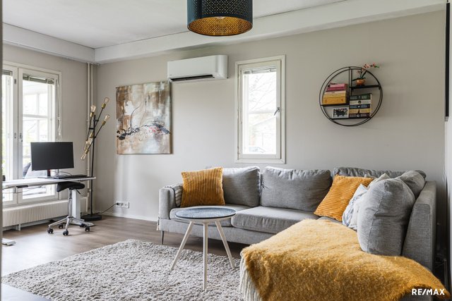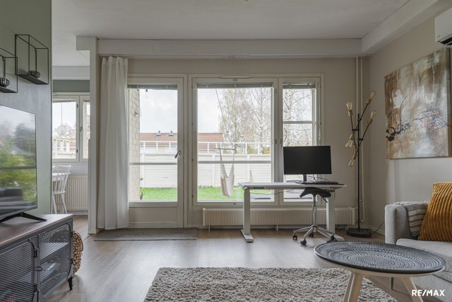 Asunnossa on kaksi tilavaa makuuhuonetta, jotka on sijoitettu eteisen molemmin puolin antaen nukkumarauhaa perheenjäsenille, joilla erilaiset unirytmit. Keittiö on oma tilansa, mutta kuitenkin ruokatilan kautta yhteydessä olohuoneeseen. Etelään avautuva nurmipiha on aidattu puuaidalla ja kulku sinne tapahtuu joko suoraan olohuoneesta tai pihaportin kautta. Asunnossa on myös oma sauna, ilmalämpöpumppu ja valoo-valokuituliittymä.