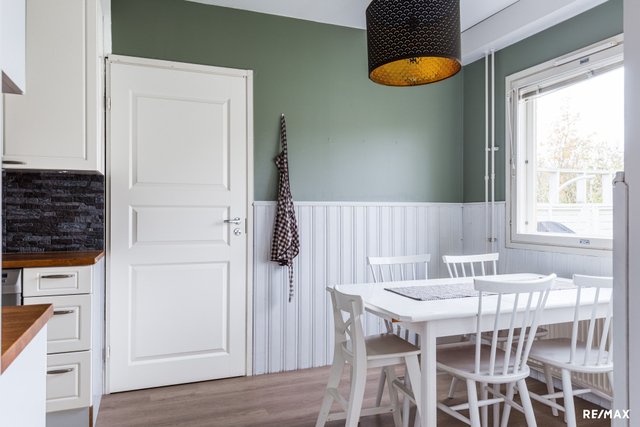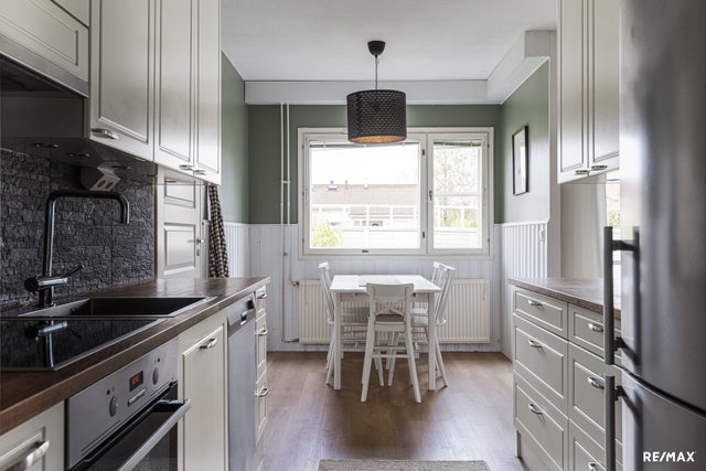 - Keittiö on remontoitu noin 10 vuotta sitten. Kaapistot ovat vielä hyvässä kunnossa, tiskialtaan alakaapin ovessa pientä kulumaa. Puinen taso palvelee pienellä hionnalla ja säännöllisellä öljyämisellä monet ruoanlaitot.