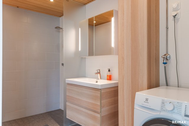 - Pesukoneliitäntä, lattialämmitys, suihku, allaskaappi, pesuallas, peilikaappi, korkea kaappi, ja suihkuseinä (Kapea suihkuseinä)
