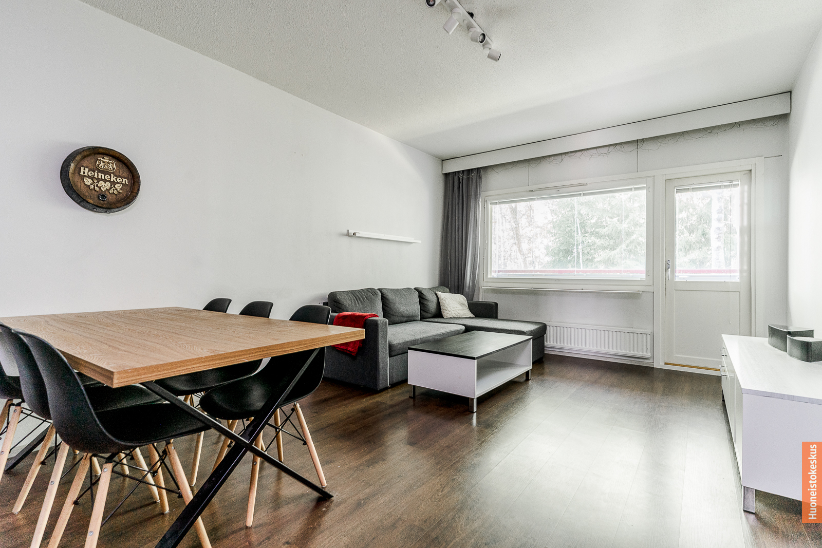 Tilavasta olohuoneesta avautuu käynti lasitetulle parvekkeelle, jolta avautuu suojaisa, metsäinen maisema – täydellinen paikka nauttia rauhallisista hetkistä. Makuuhuoneessa on reilusti säilytystilaa ison kaapiston ansiosta, ja sinne mahtuu mukavasti myös työpiste. Keittiöstä ja makuuhuoneesta avautuvat näkymät rauhalliselle sisäpihalle, jossa sijaitsevat taloyhtiön leikki- ja grillialueet.