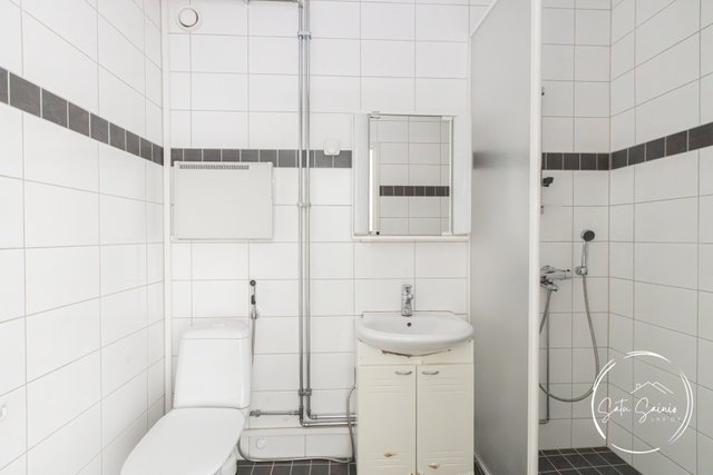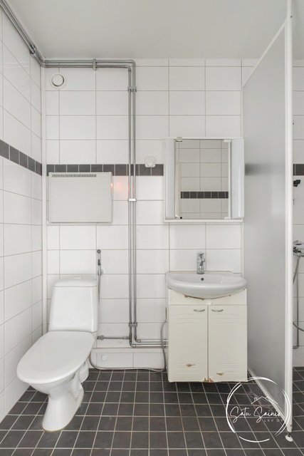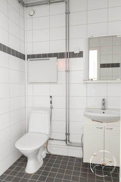 - Vaalea pesutila saneerattu yhtiön toimesta v. 2008-2012 välillä (kts. kunnossapitotarvesuunnitelman tehdyt remontit). Varusteet: suihku, suihkuseinä, wc-istuin, käsienpesuallas, allaskaappi, peilikaappi, bideesuihku ja seinäpatteri. Lattia laattaa, seinä kaakelia.
