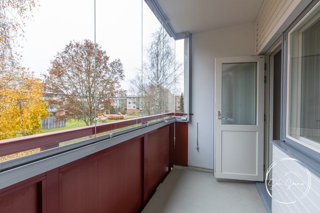 Olohuoneesta pääset lasitetulle parvekkeelle, josta avautuvat näkymät sisäpihalle.