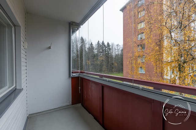 - Olohuoneesta kulku lasitetulle parvekkeelle. Lattia muovimattoa, seinät maalattu/ tapettia.