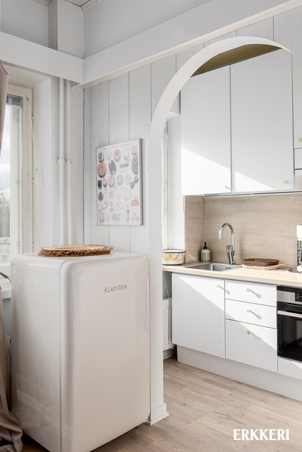 Tervetuloa tutustumaan tähän muuttovalmiseen 1H, KK, KPH -asuntoon, joka hurmaa tehokkailla ja hyvin käytetyillä neliöillä. Tämä valoisa koti sijaitsee 3. kerroksessa, ja sen ikkunoista avautuu rauhallinen näkymä, sillä kadun toisella puolella olevassa asuintalossa ei ole ikkunoita kadulle päin.