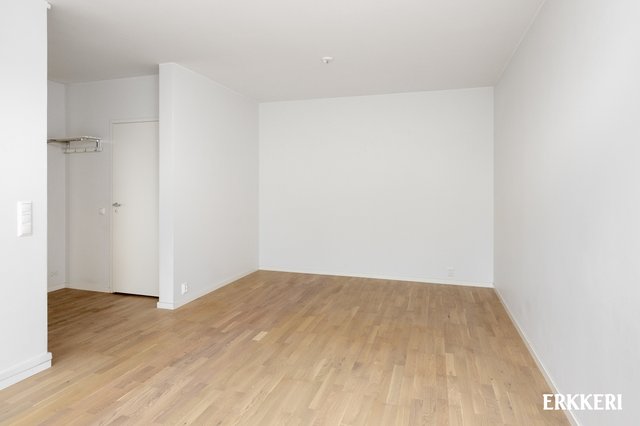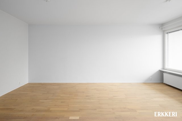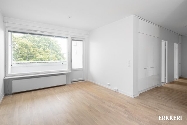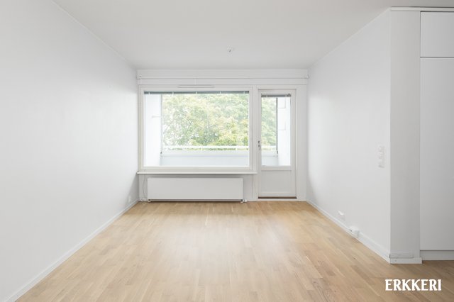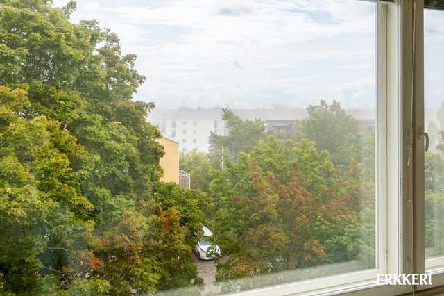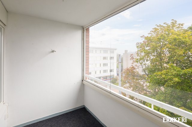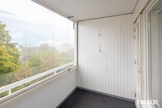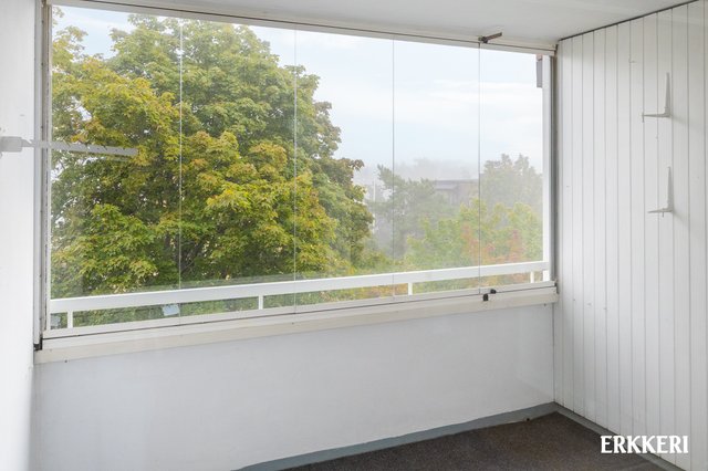 Olohuone on suuri ja helposti sisustettava, ja valtava ikkuna avaa kodin valolle. Lasitettu parveke jatkaa oleskelutilaa ja toimii lisähuoneena keväästä pitkälle syksyyn.