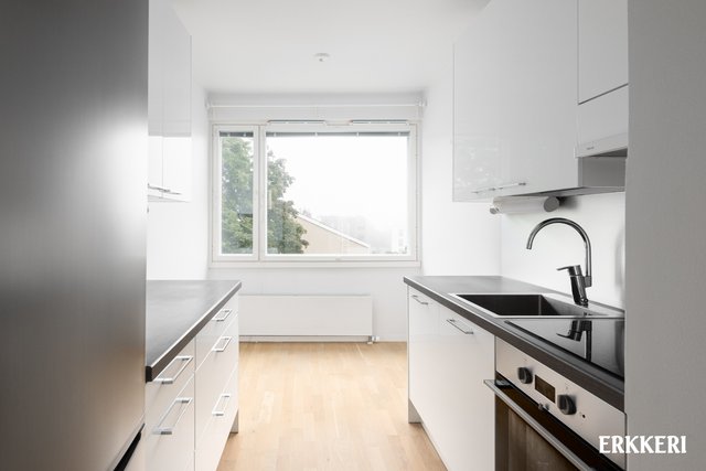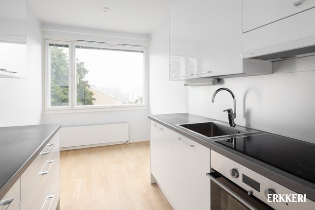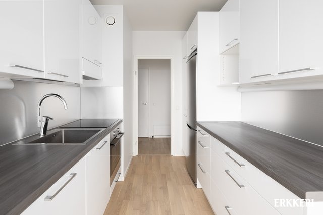 Keittiö on erillinen ja käytännöllinen. Kylpyhuone on täysin uusittu taloyhtiön LVIS-remontissa – huoleton ja nykyaikainen.