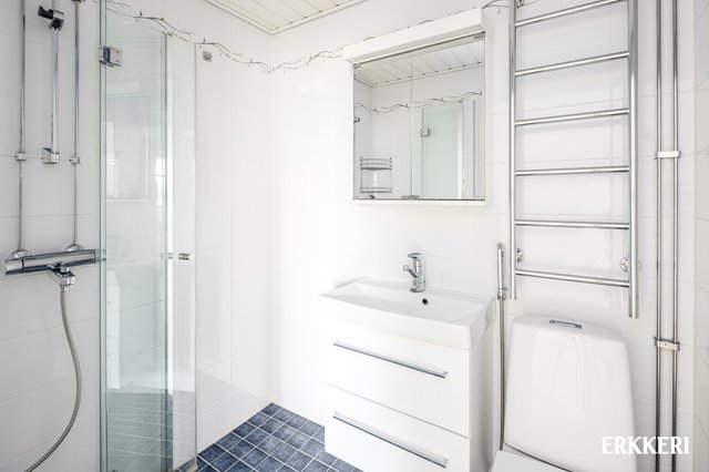 - WC-istuin, suihku, suihkuseinä, pesukoneliitäntä, peilikaappi, pesuallas, allaskaappi, ja bidee-suihku