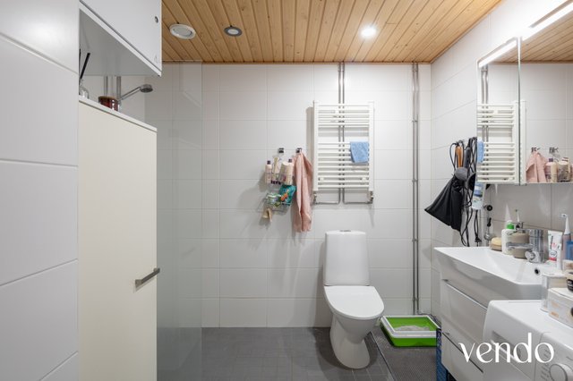 - WC-istuin, suihku, suihkuseinä, pesukoneliitäntä, lattialämmitys, peilikaappi, pesuallas, allaskaappi, ja bidee-suihku