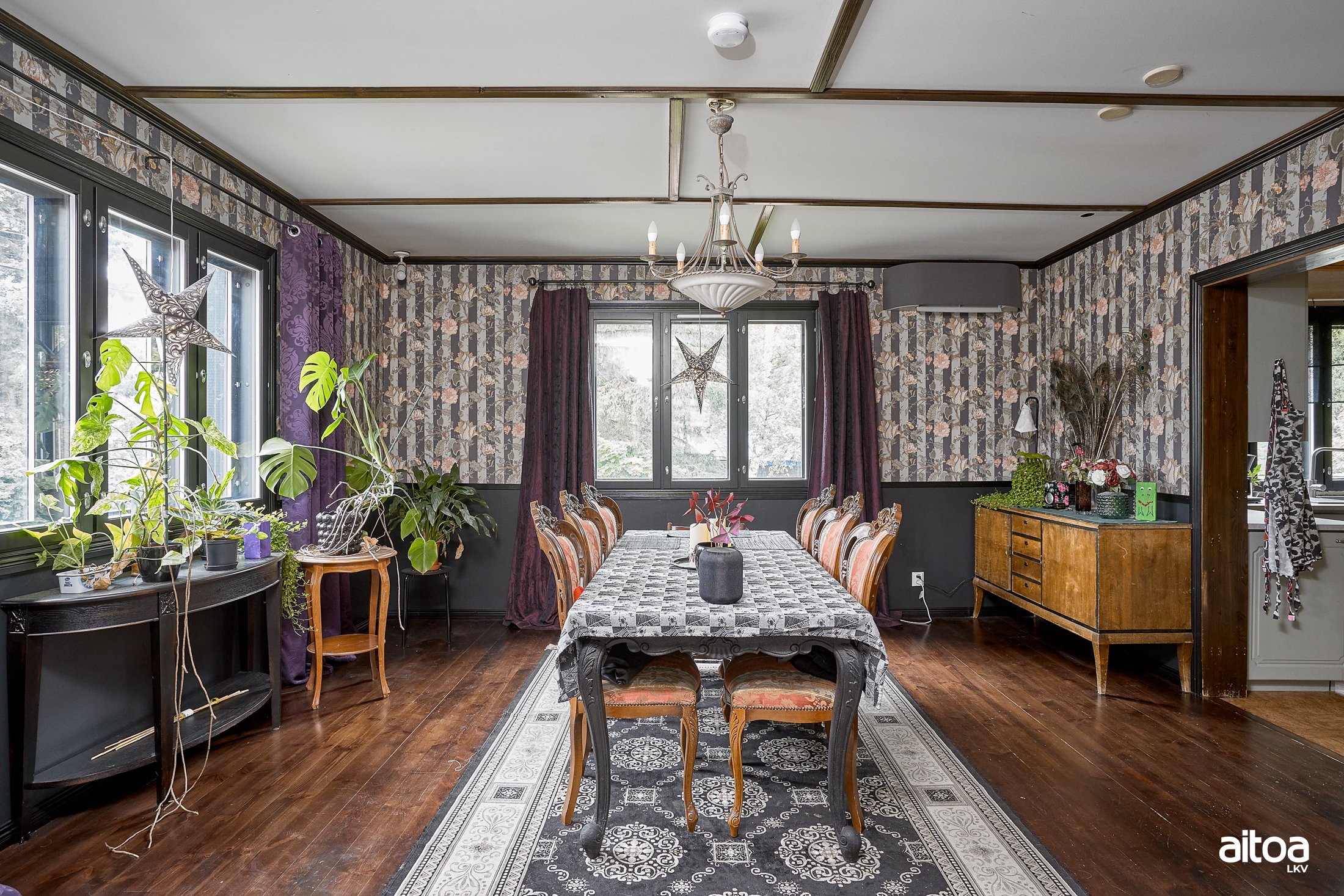 Ainutlaatuinen ja persoonallinen omakotitalo Kotkan Popinniemessä! Tämä viehättävä 1945 valmistunut talo tarjoaa erinomaiset puitteet perhe-elämälle. Tummanpuhuva värimaailma, yksityiskohtaiset listoitukset ja koristeelliset mustat ikkunat luovat salaperäisen ilmapiirin. Talossa on viisi makuuhuonetta, joten tilaa riittää suuremmallekin perheelle. Alakerran olohuoneessa on varaava takka, joka luo lämpöä ja tunnelmaa viileisiin iltoihin.