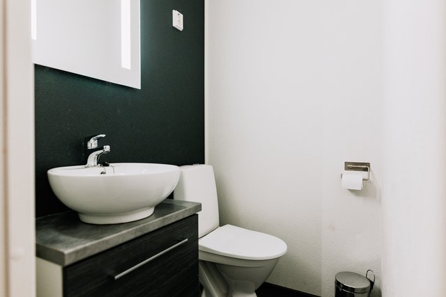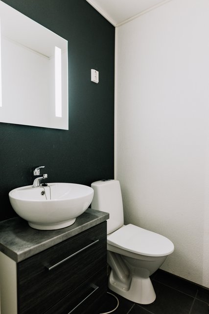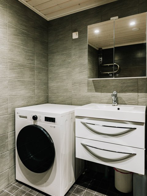 - WC-istuin, suihku (sadesuihku), pesukoneliitäntä, peilikaappi, pesuallas, ja allaskaappi