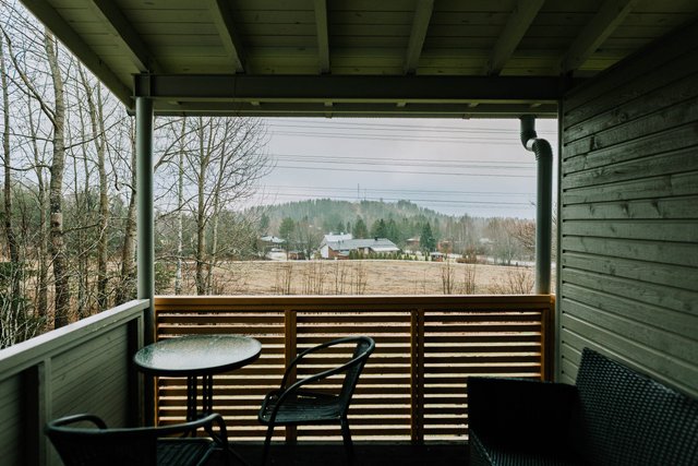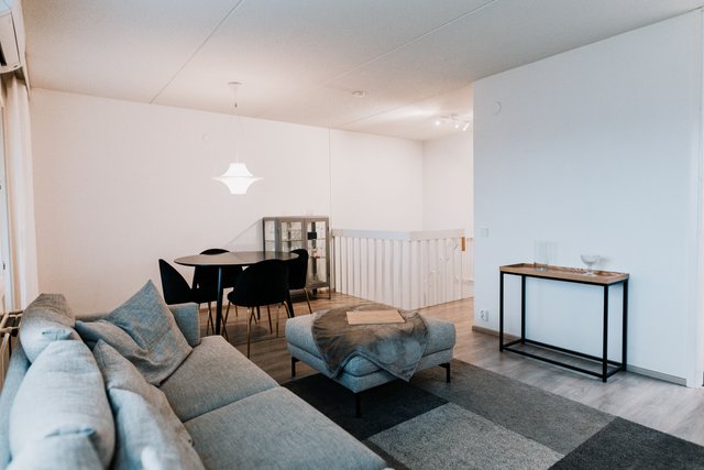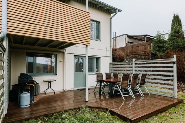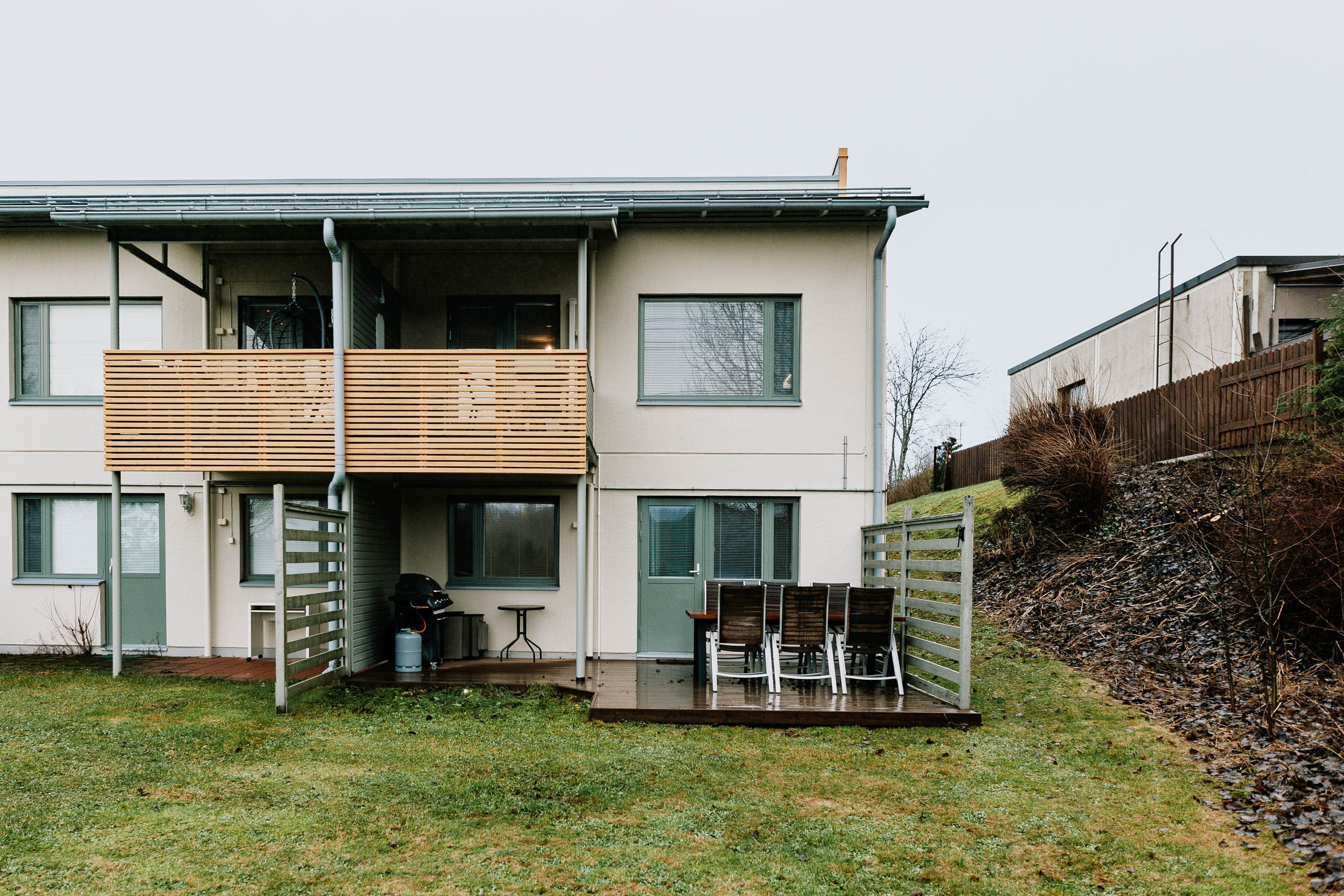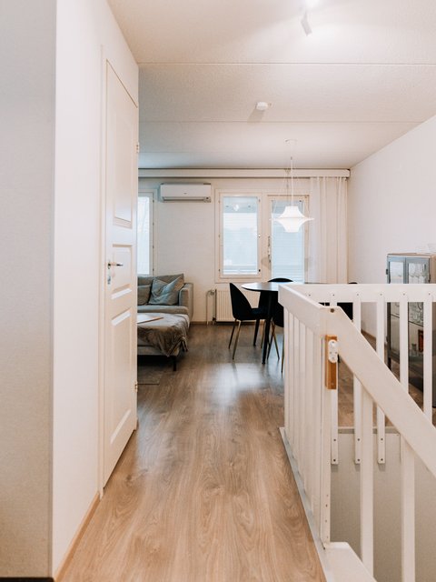 Asuintilat kahdessa kerroksessa. Tyylikäs keittiö ja moderni saunaosasto. Takapihalla siisti patio josta näkymät viereiselle niitylle. Paljon säilytystilaa.