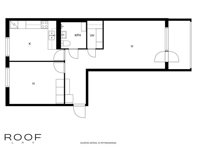 - Tilava olohuone, josta on käynti parvekkeelle. Lattia vinyylilankkua ja seinät maalattu. Olohuoneen yhteydessä on vaatehuone/varasto.