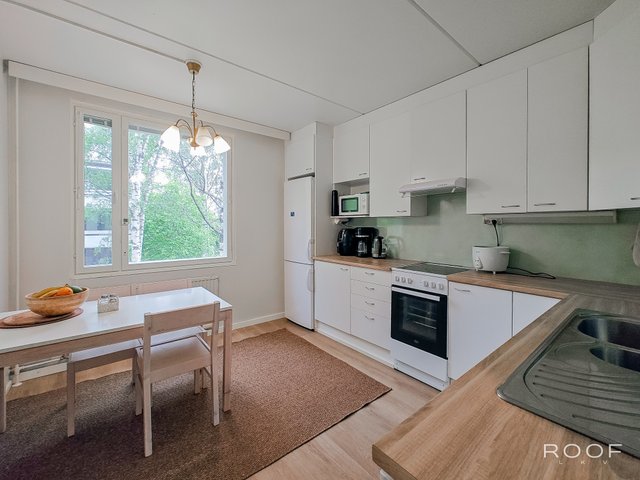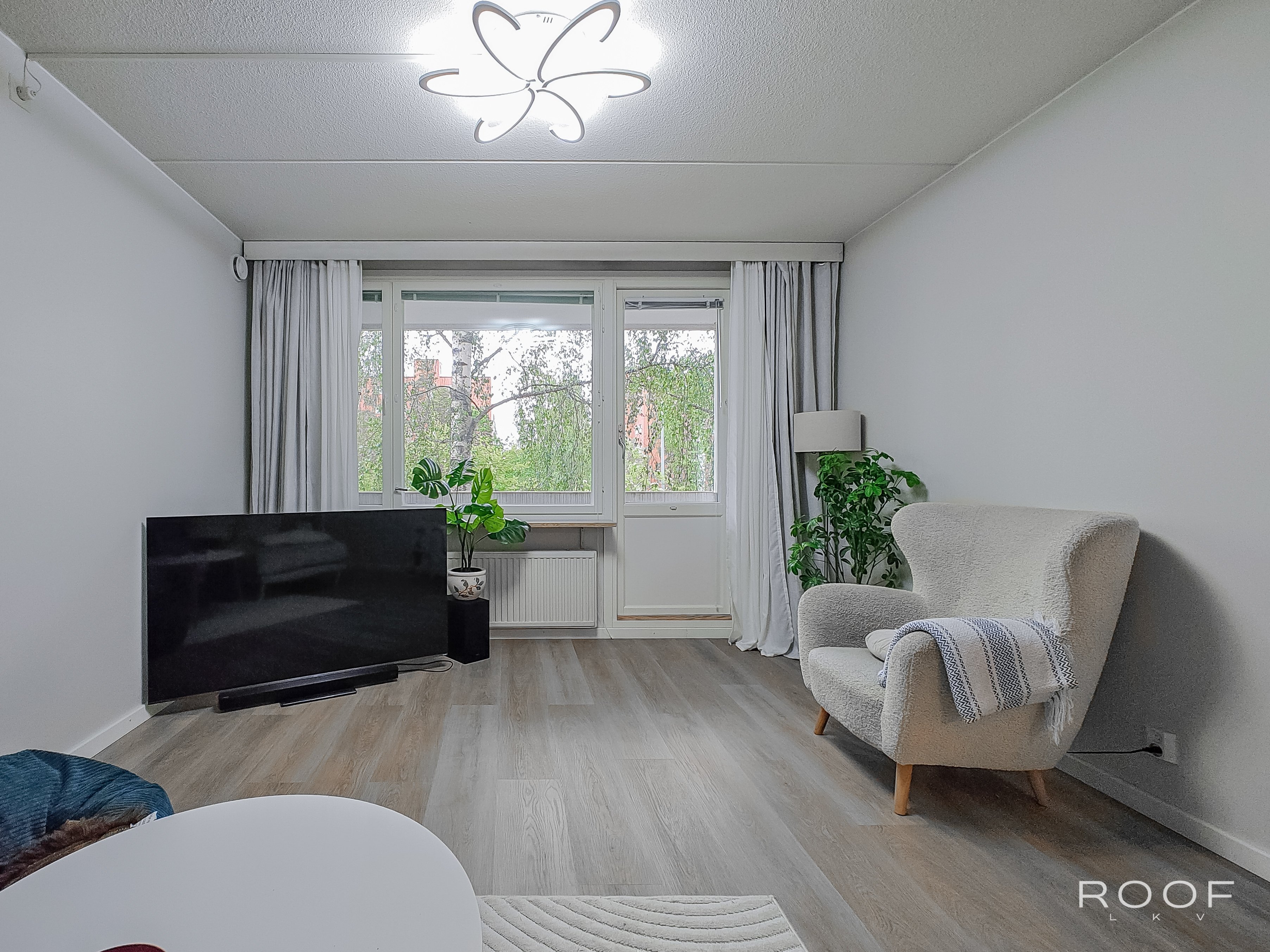 Taloyhtiössä on perinteinen linjasaneeraus toteutettu 2020 ja sen yhteydessä on kylpyhuone uusittu kokonaan. Asunnossa on tehty pintaremonttia vuonna 2023, jolloin on uusittu lattiat, listat ja maalattu seinät. Lisäksi säilytysratkaisut on uusittu. Keittiö on hyväkuntoinen ja sinne mahtuu hyvin ruokailupöytä. Olohuoneen yhteydessä on tilava vaatehuone. Parveke on etelän suuntaan. Yhtiössä on hiljattain valmistunut ikkuna-ja oviremontti. Asunto on vuokrattu yhden kuukauden irtisanomisajalla.