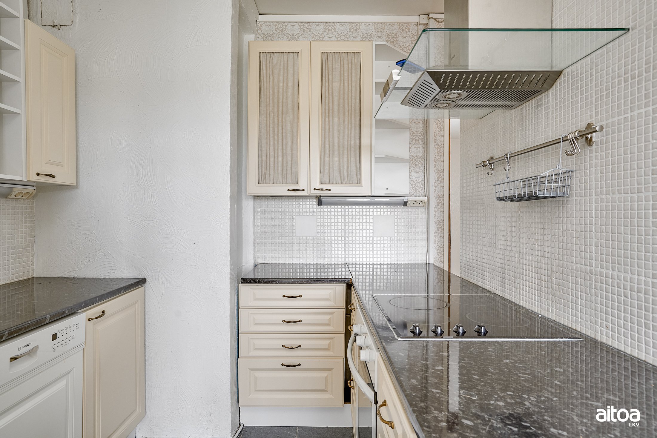 - Jääkaappi/pakastin (2021), liesituuletin, keraaminen liesitaso, erillisuuni, astianpesukone.