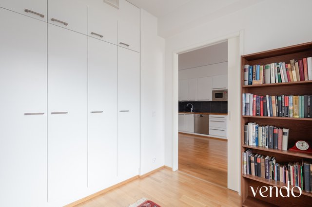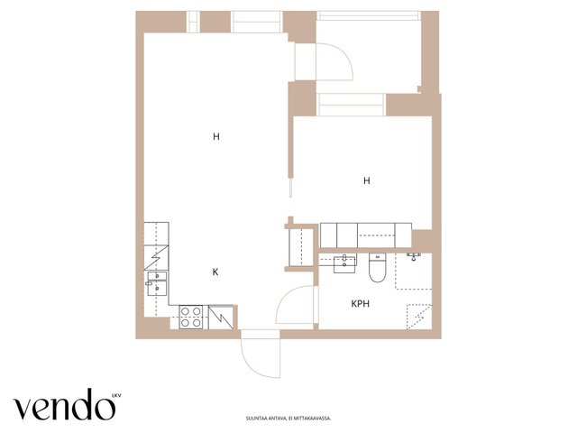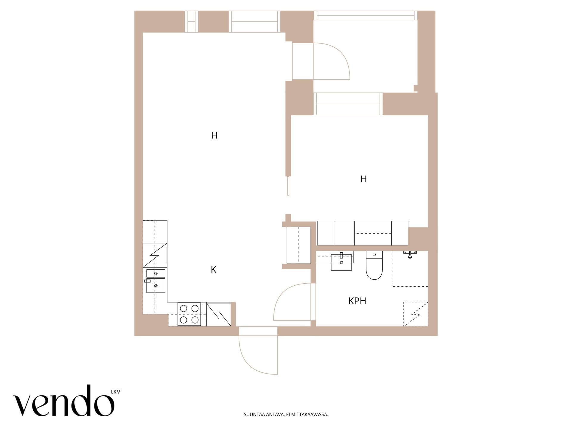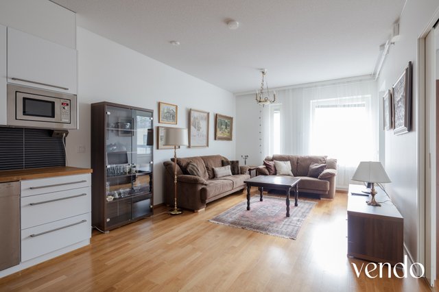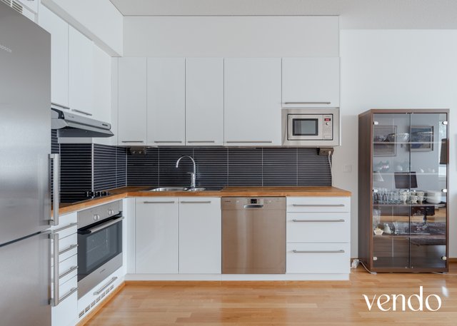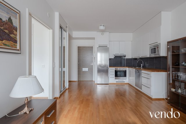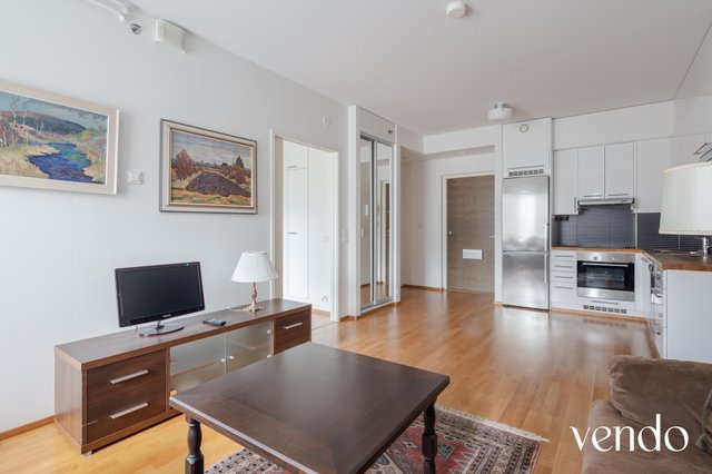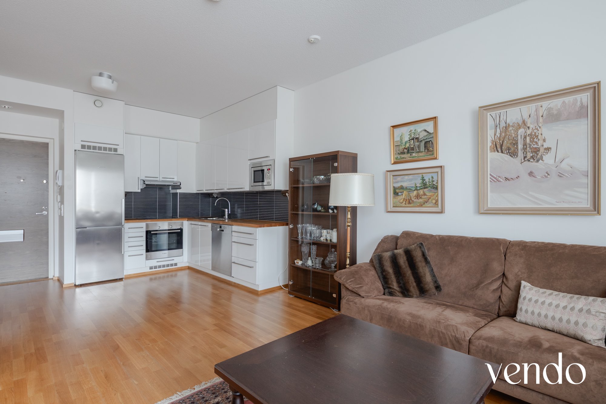 Avarassa olohuoneessa ja modernissa avokeittiössä on toimiva, yhtenäinen pohjaratkaisu. Suuret ikkunat tuovat runsaasti luonnonvaloa, ja näkymät avautuvat talon rauhalliselle puolelle. Olohuoneen ja makuuhuoneen tyylikäs parkettilattia lisää kodikkuutta. Keittiössä on kaikki tarpeelliset kodinkoneet, mm. astianpesukone ja mikroaaltouuni, sujuvaa arkea varten.