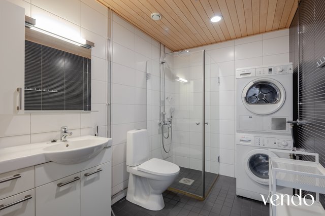 - WC-istuin, suihku, suihkuseinä, pesukoneliitäntä, lattialämmitys, peili, pesuallas, allaskaappi, ja bidee-suihku