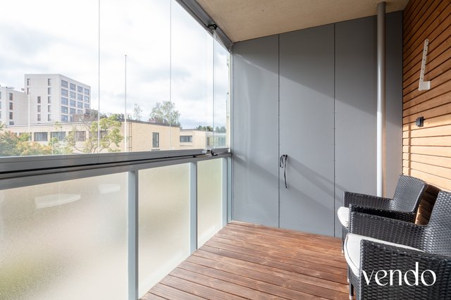 Tilavassa kylpyhuoneessa on lattialämmitys ja pesukoneliitäntä. Lasitettu parveke avautuu hiljaiselle, suojaisalle puolelle – miellyttävä paikka päivänhetkeen ympäri vuoden.