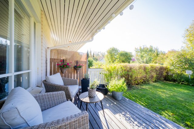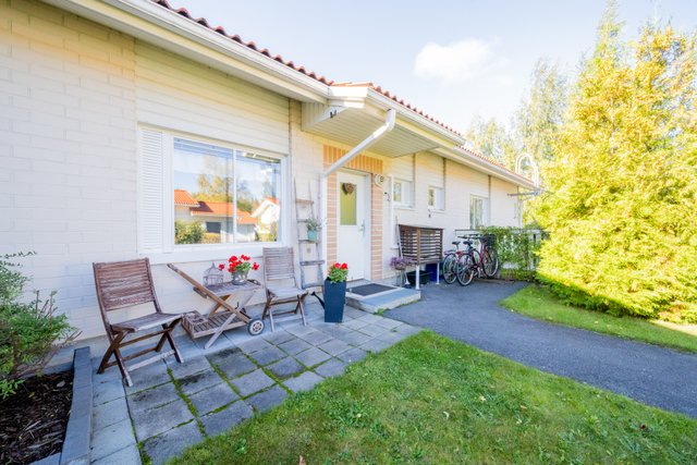 - Takapihalla koko huoneiston levyinen terassi. Etupihalla kivetyksin päällystetty patio.