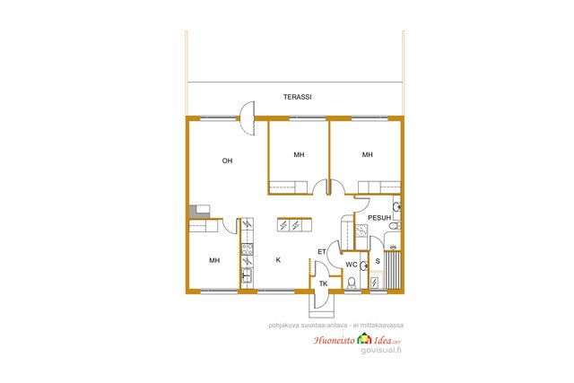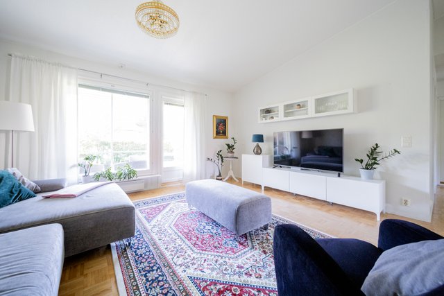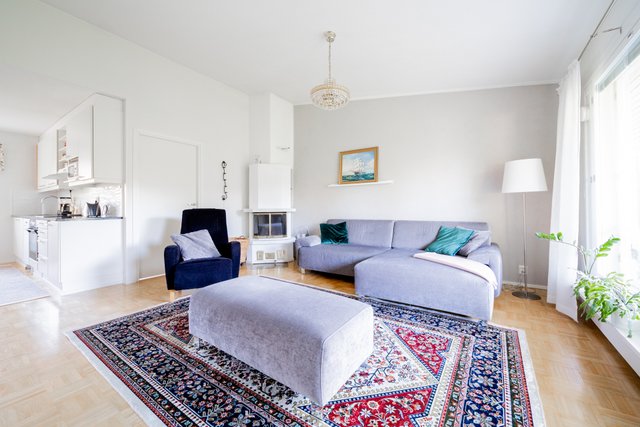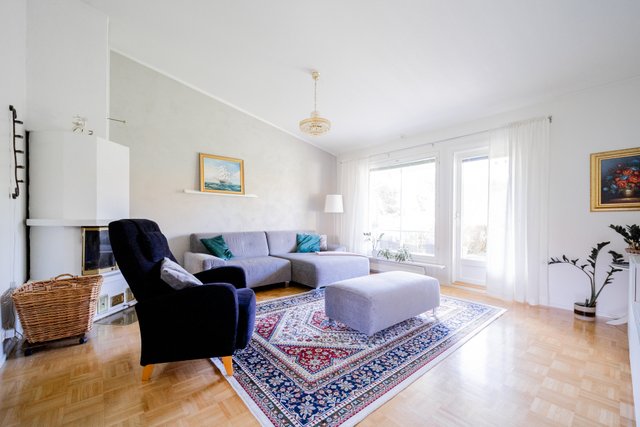 - Valoisa avara tila, jossa viistokorotettu katto lisää tilan tuntua. Lisälämmön ja tunnelmanluojana varaava kaakelitakka. Käynti terassille ja aurinkoiselle, suojaisalle takapihalle.