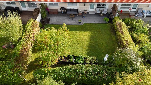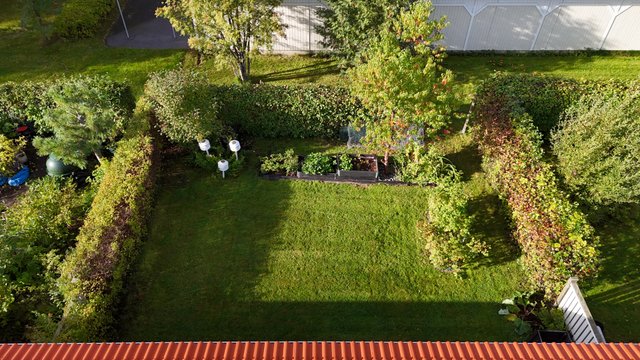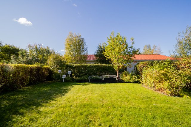 - Pensasaidoin rajatut alueet. Takapihalla on runsaasti hyötyistutuksia, mm. vadelmapensaita, marjapensaita, mansikkapenkki ja viljelyslaatikot. Etupihalla oleskelutilaa kivetyllä patiolla ja tilaa mm. polkupyörille.