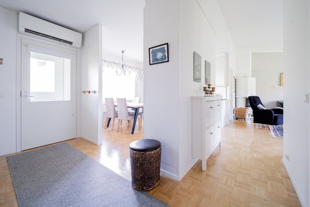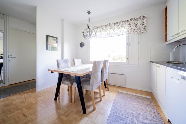 Ajaton keittiö on varusteltu valkoisilla kalusteilla ja kattavalla kodinkoneistuksella. Kylpyhuone ja sauna ovat päivitetty nykyaikaisiksi. Kolme makuuhuonetta tarjoavat tilaa koko perheelle, ja erillinen wc eteisaulan yhteydessä tuo käytännöllisyyttä arkeen. Ilmalämpöpumppu lämmittää kylminä aikoina ja viilentää kesähelteillä.