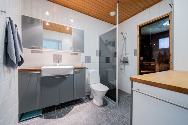 - WC-istuin, suihku, pesukoneliitäntä, peilikaappi, lattialämmitys, pesuallas, allaskaappi, suihkuseinä, ja bidee-suihku