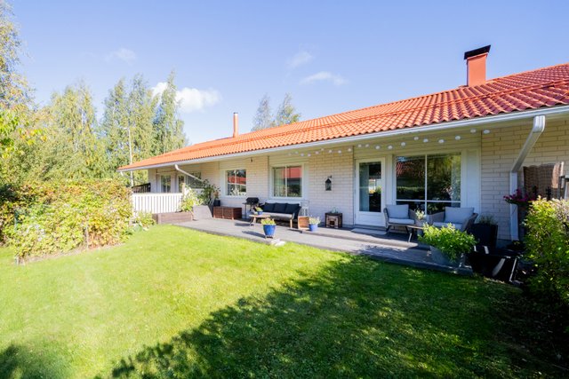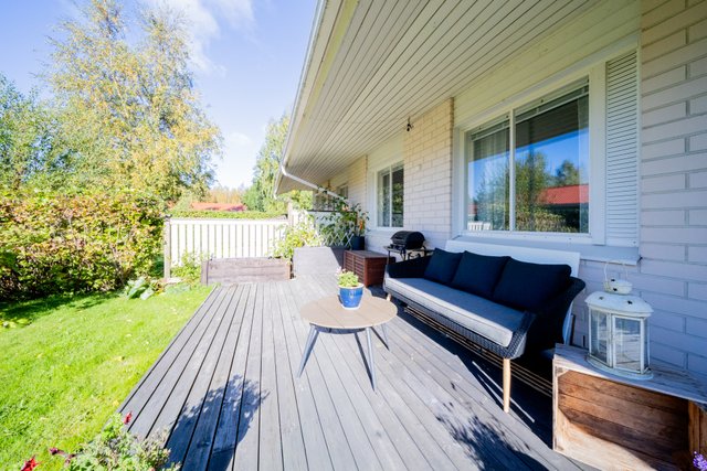 Kodin sydän on avara ja valoisa olohuone, jossa viistokorotettu katto luo tilantuntua ja mukavuutta. Varaava kaakelitakka antaa lisälämpöä ja tunnelmaa. Olohuoneesta on käynti tilavalle, aurinkoiselle terassille, joka avautuu suojaisalle takapihalle. Hyötyistutukset, kuten vadelma- ja marjapensaat sekä mansikkapenkki ilahduttavat viherpeukaloa. Etupihan puolellakin on suojaisa pensasaita sekä tilaa puutarhakalusteille ja esimerkiksi polkupyörille.