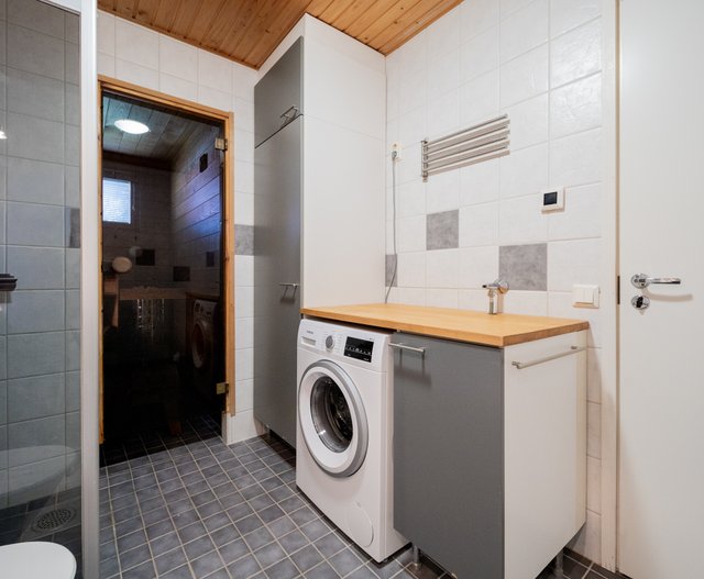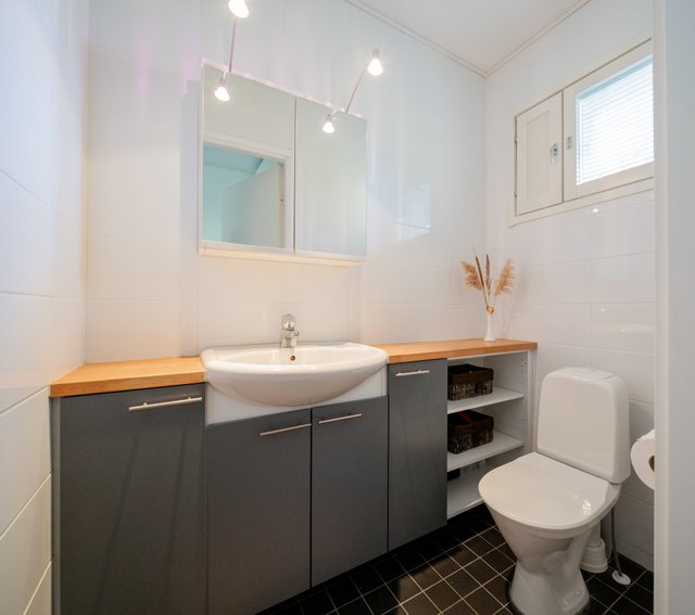 - Erillinen, kalustettu wc eteisaulan yhteydessä. Kylpyhuoneessa toinen wc-istuin.