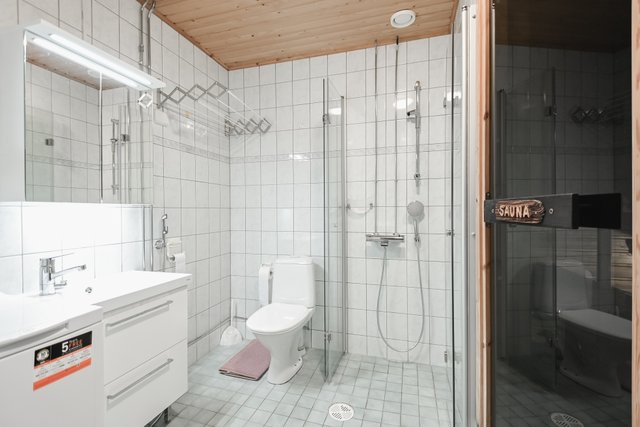 - WC-istuin, suihku, suihkuseinä, bidee-suihku, allaskaappi, pesukone, peilikaappi, ja pesukoneliitäntä