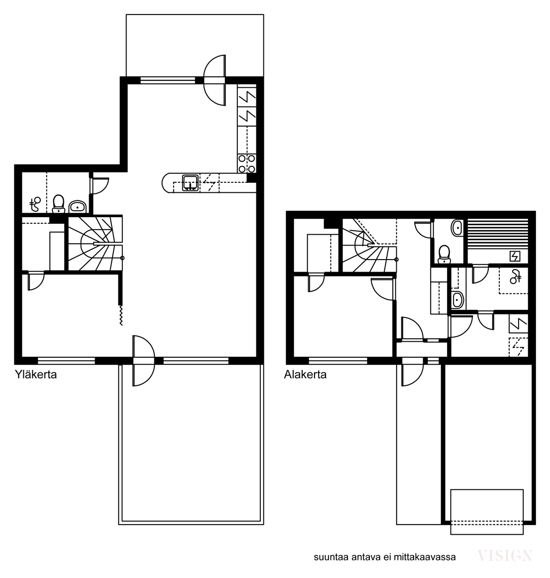 - Yläkerran makuuhuoneen lattia on parkettia ja alakerran makuuhuoneen laminaattia. Molempien makuuhuoneiden yhteydessä on vaatehuone.